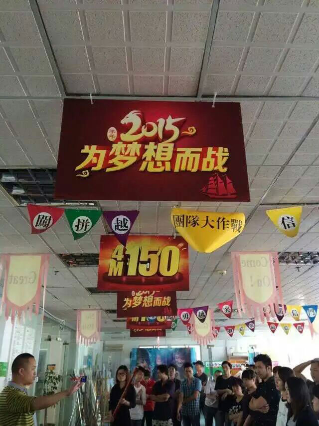 公司制定了2015財年的奮斗目標,確定每個部門的業(yè)績目標,團隊間進行PK,隊員確立自己的奮斗夢想。“為夢想而戰(zhàn)”宣誓儀式啟動。我們全力以赴,爭做珠三角數(shù)一數(shù)二的品牌噴繪公司。