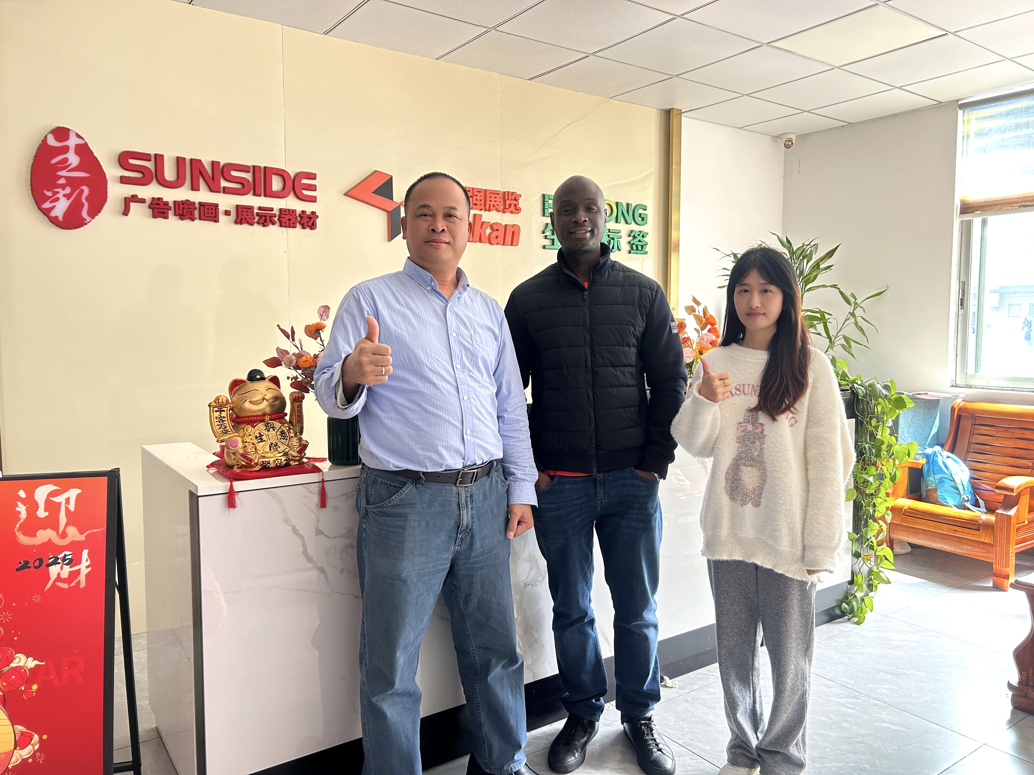 2025年1月, Camil 回訪了生彩廣告,他是加拿大一家知名安保公司的CEO,也是我們合作7年之久的老朋友,他以往主要是在我們公司下單PVC發(fā)泡板、模切貼紙和戶外廣告布。這次回訪,他主要是從我們公司下單了玻璃貼和易拉寶這兩種廣告宣傳產品。同時我們也為他推薦了新產品,引起了他的濃厚的興趣,如壁虎貼、章魚貼、蜘蛛貼等無泡系列產品,也介紹了這些產品所具備的易張貼、易移除、安裝輕松、節(jié)省人力成本、無氣泡、不留殘膠、材料環(huán)保、色彩鮮艷持久的特點。此外,Camil參觀了我們的無塵車間,觀摩了我們的UV噴繪機器和整個生產、質檢流程,肯定了我們公司所具備的生產實力,為我們給客戶提供的優(yōu)質服務點贊。